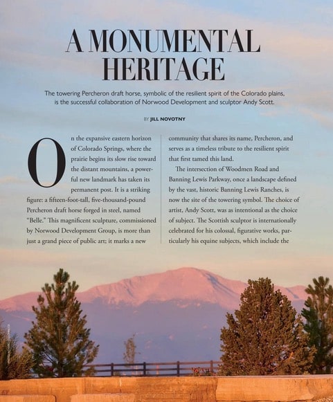 “Belle” is the recently erected 5,000-pound steel sculpture of a Percheron draft horse by world-renowned Scottish sculptor Andy Scott. She now towers 15 feet high in Norwood Development Group’s new Percheron, a planned community at East Woodmen Road and Banning Lewis Parkway.